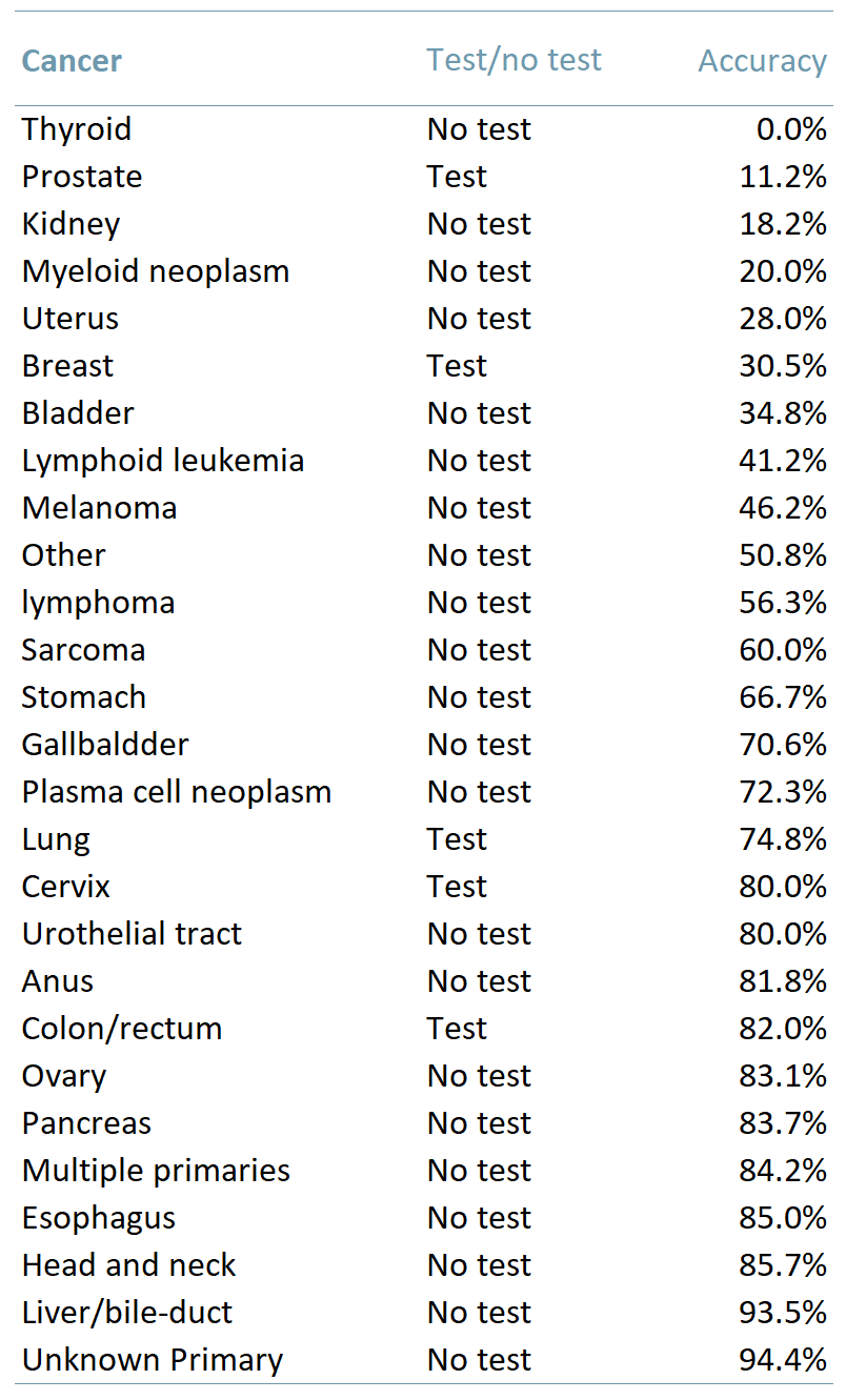 Exhibit 1 – Accuracy of Grail’s MCED test depending on the type of cancer
