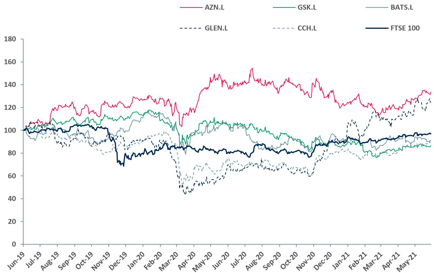 Exhibit 2 – Price relative top five ESG rated companies vs. FTSE 100 2019-2021