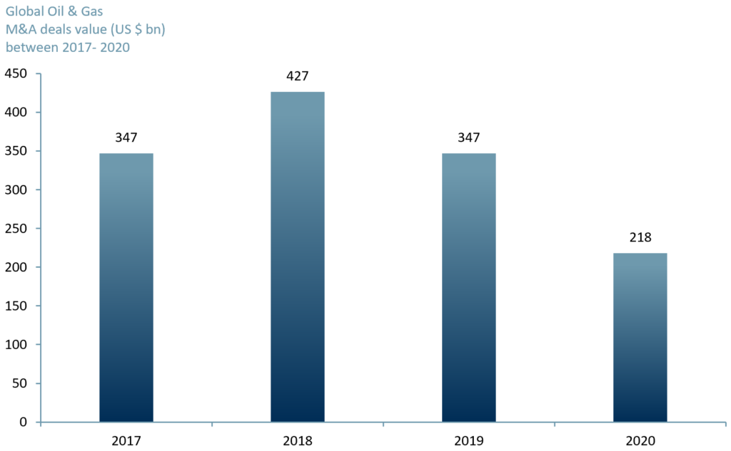 In 2020, total oil & gas M&A deal values reached $218bn, down from $347bn in 2019. (Deloitte, 2021). The number of M&A deals in the oil & gas sector also fell over the period with 258 deals in 2020 vs. 433 in 2019.