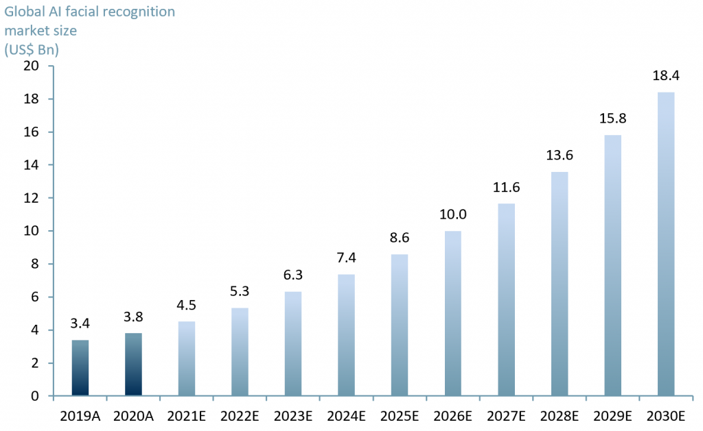 In 2020 the AI facial recognition market was estimated to have reached US$ 3.8bn (see exhibit 1 below).