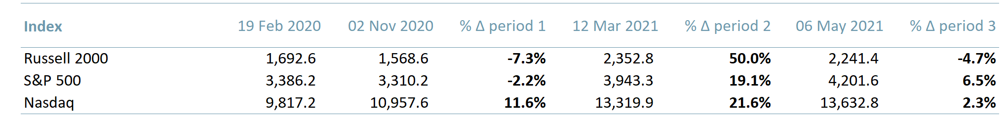 Exhibit 2 – Table showing the performance of US indices 19022020 – 06052021