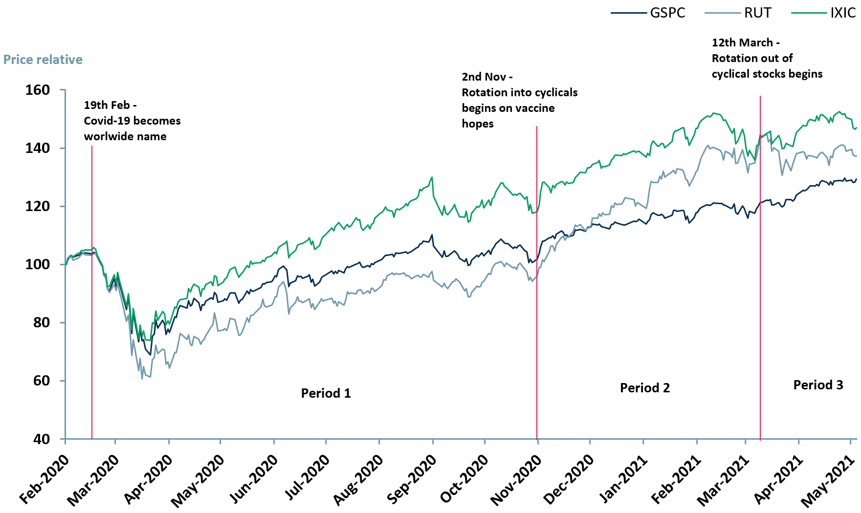 Exhibit 3 – Price relative performance of the S&P 500 GSPC Russell 2000 RUT and Nasdaq IXIC 03022021 – 23052021