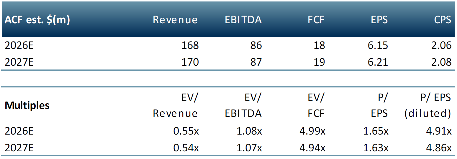 Revenue 2030E $175m up 4% vs. $168m 2026E