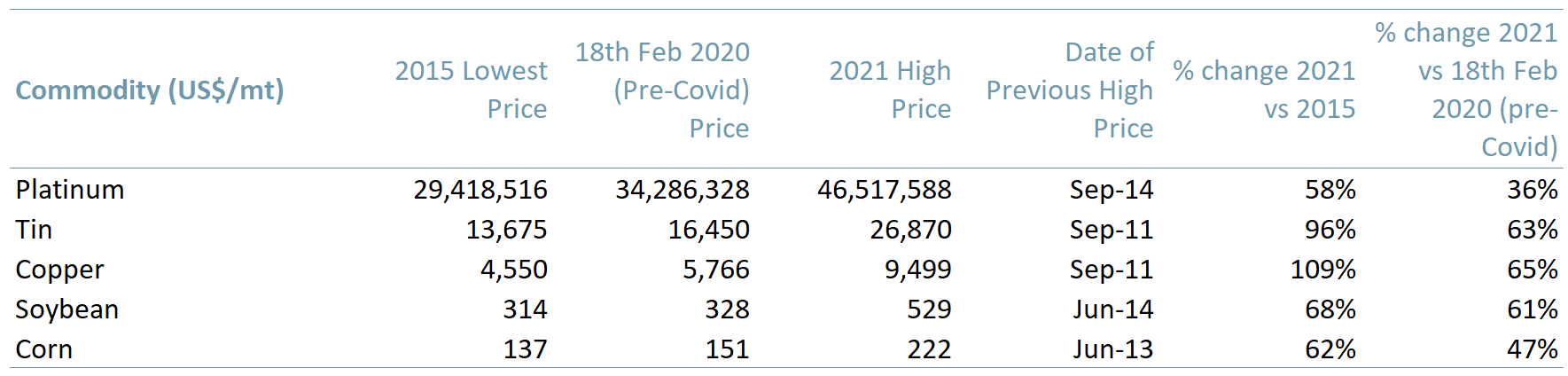 Exhibit 1 – Prices of platinum tin copper soybean corn USmt 2015 2020 2021